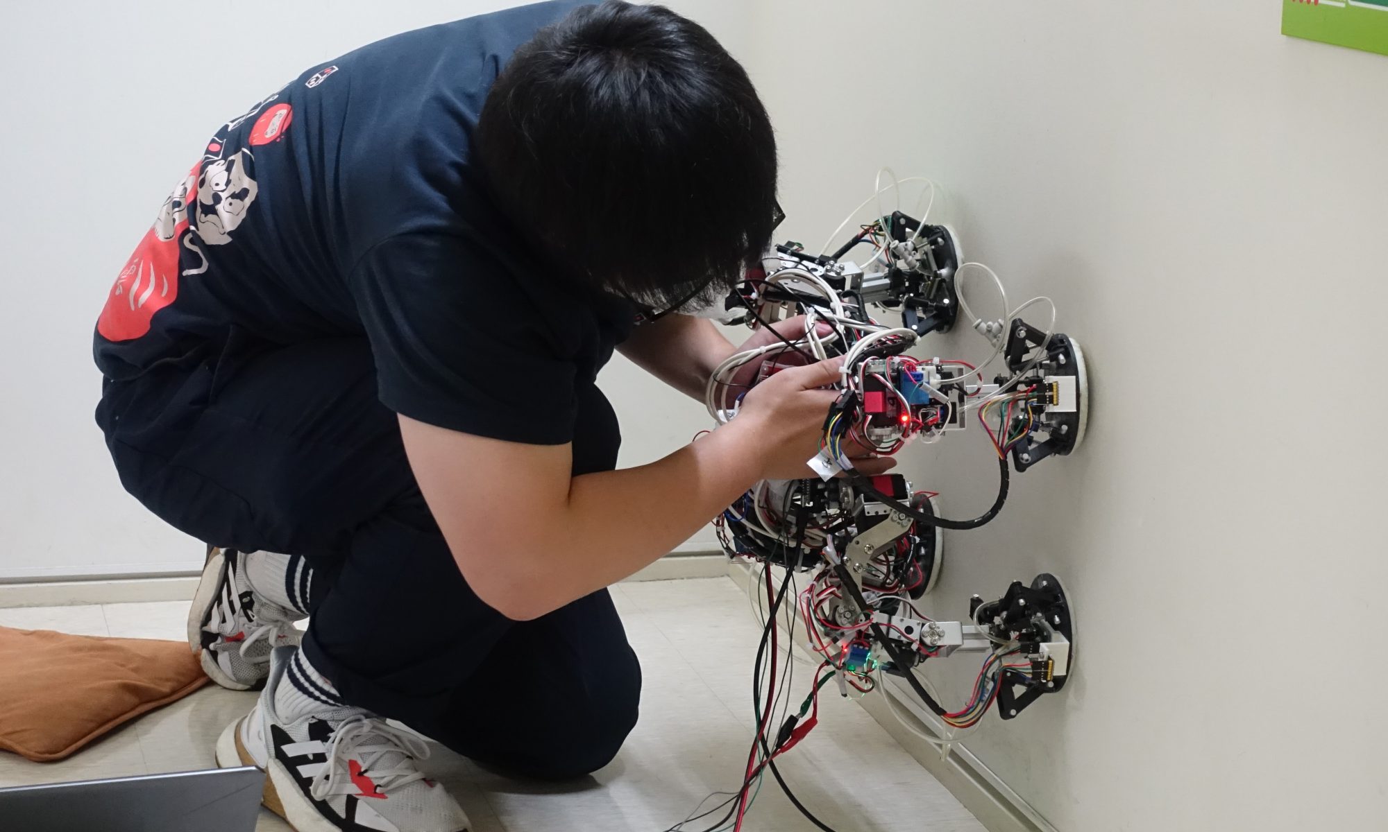 上の写真のロボットは、米田研の壁面歩行ロボットです。真空ポンプを積んでいて壁に吸い付いて移動します。研究室では現在8台の壁面で作業や検査をするロボットをつくっていますが、これは橋脚などの建造物コンクリート品質検査をするためのものです。
